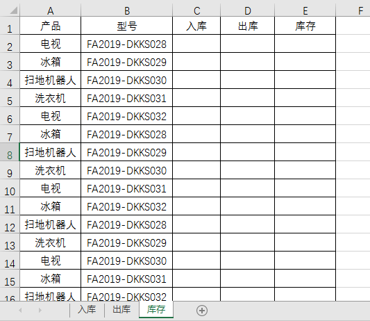 库存表中的入库,对应入库表中的产品、型号,因此我们用sumifs函数来进行多条件求和,即可。